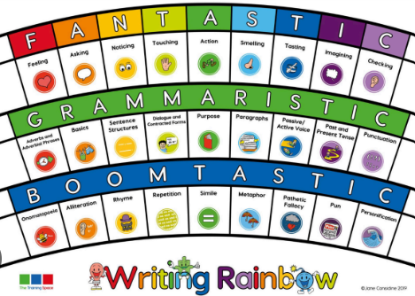 To enable our children to write effectively and coherently, we teach writing using The Write Stuff approach by Jane Considine. This approach is used across school and allows children to apply basic skills, vocabulary and grammar knowledge to write effective sentences which are full of impact and keep the reader interested. The Write Stuff brings clarity to the mechanics of teaching writing. It is introduced through the Writing Rainbow, using the three zones of writing.